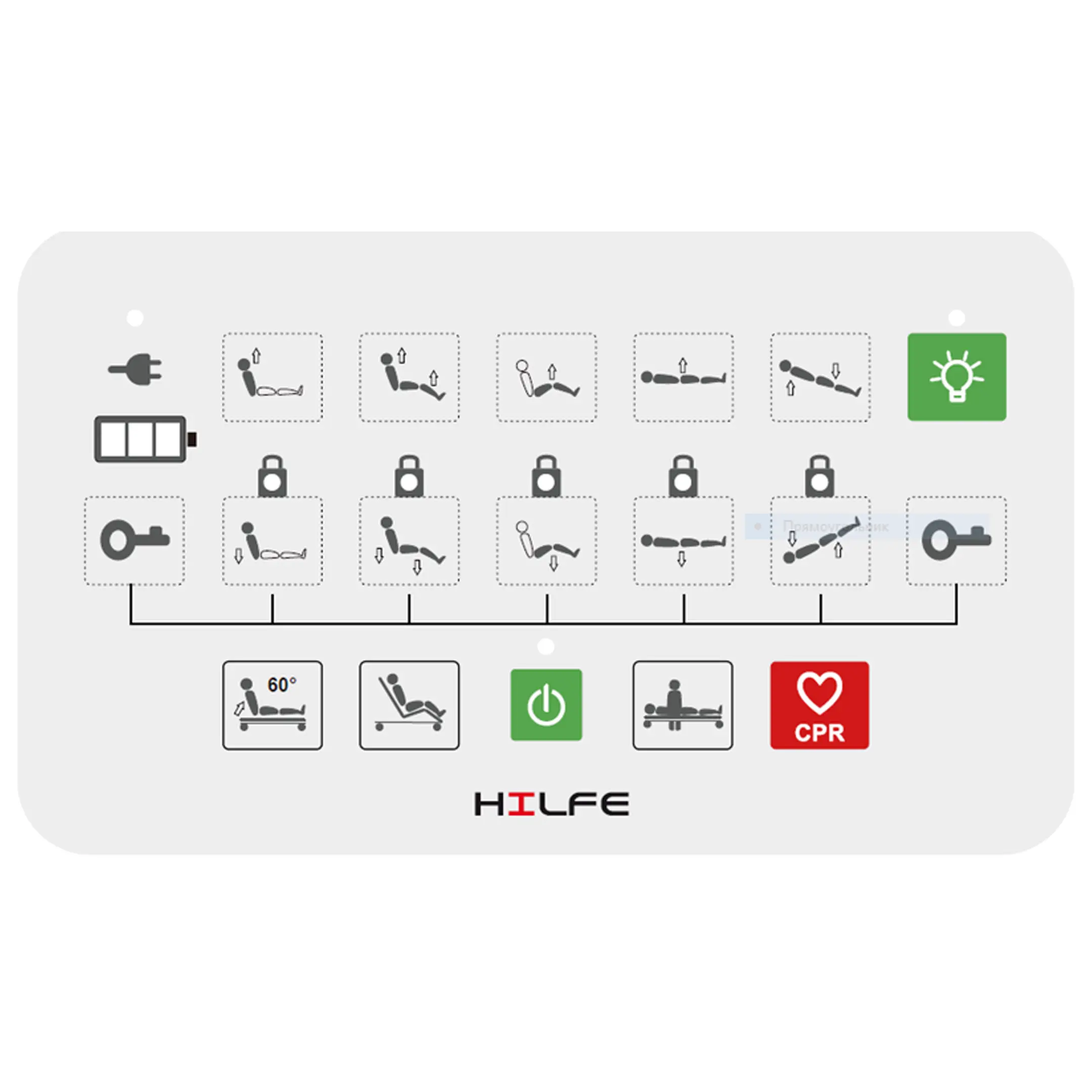 • Кнопка отключения электропитания кровати (кнопка «STOP» совместима со стандартными блоками управления MOTECK и ручными элементами управления для медицинских применений. Это экстренный выключатель питания кровати);