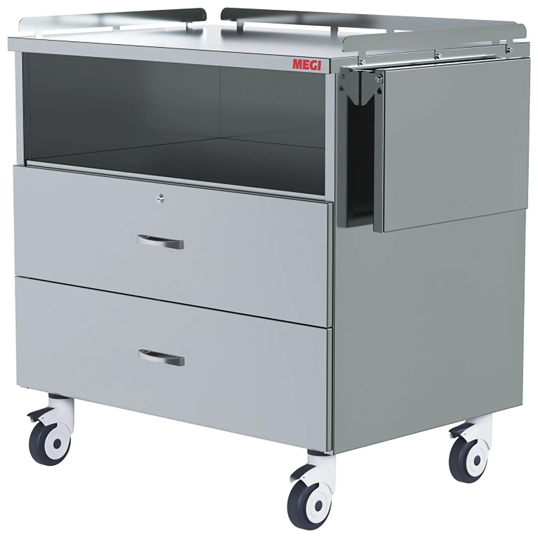 • колеса поворотные, самоориентирующиеся, диаметром 100 мм, комплектуются надёжной стальной вилкой с прецизионным радиально-упорным подшипником, ободом из полипропилена и шинкой из серого полиуретана, не оставляющего следов на полу, два колеса – с индивидуальным тормозным устройством;