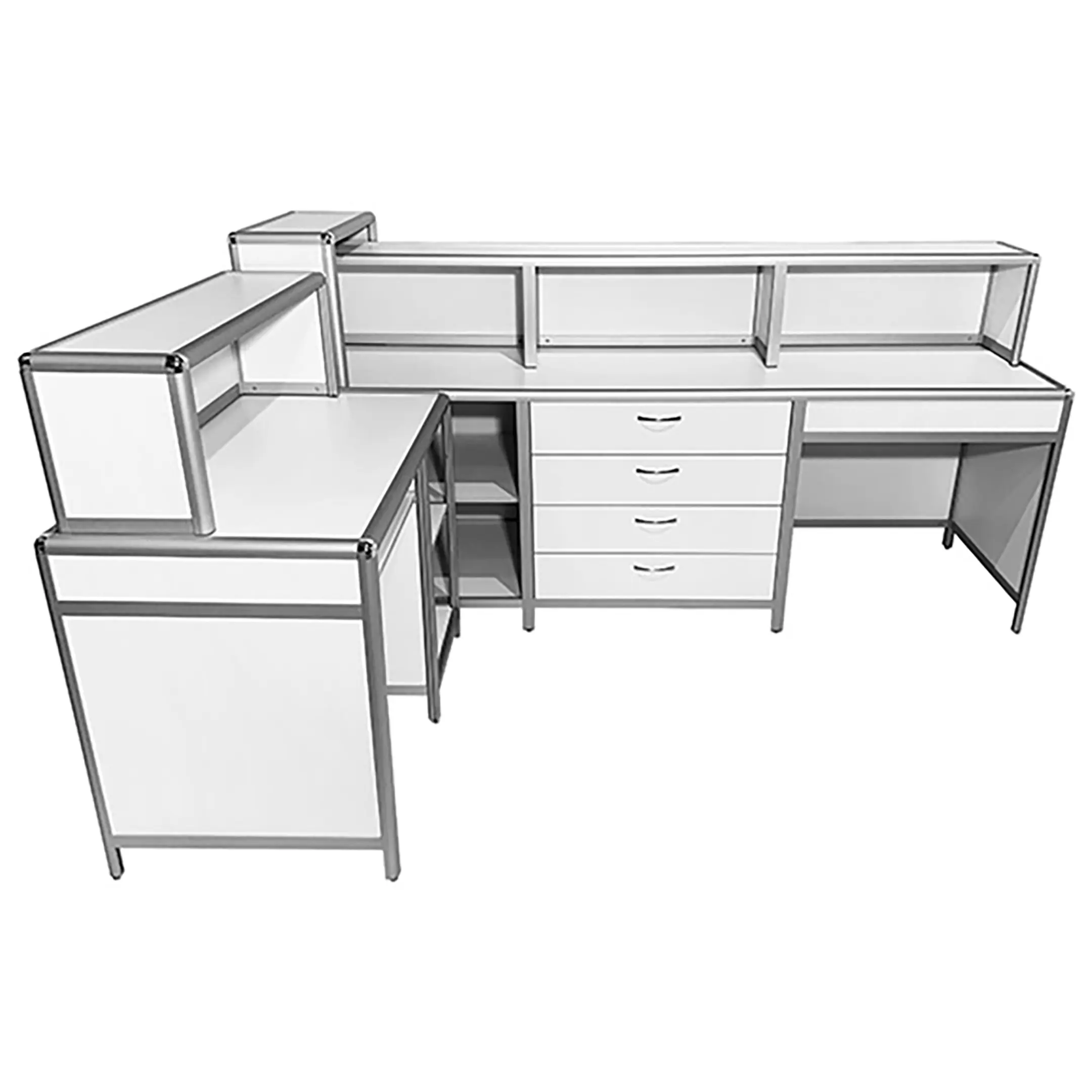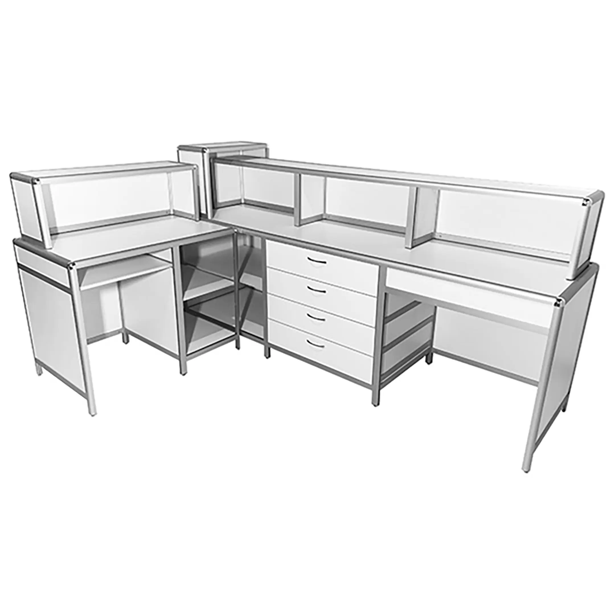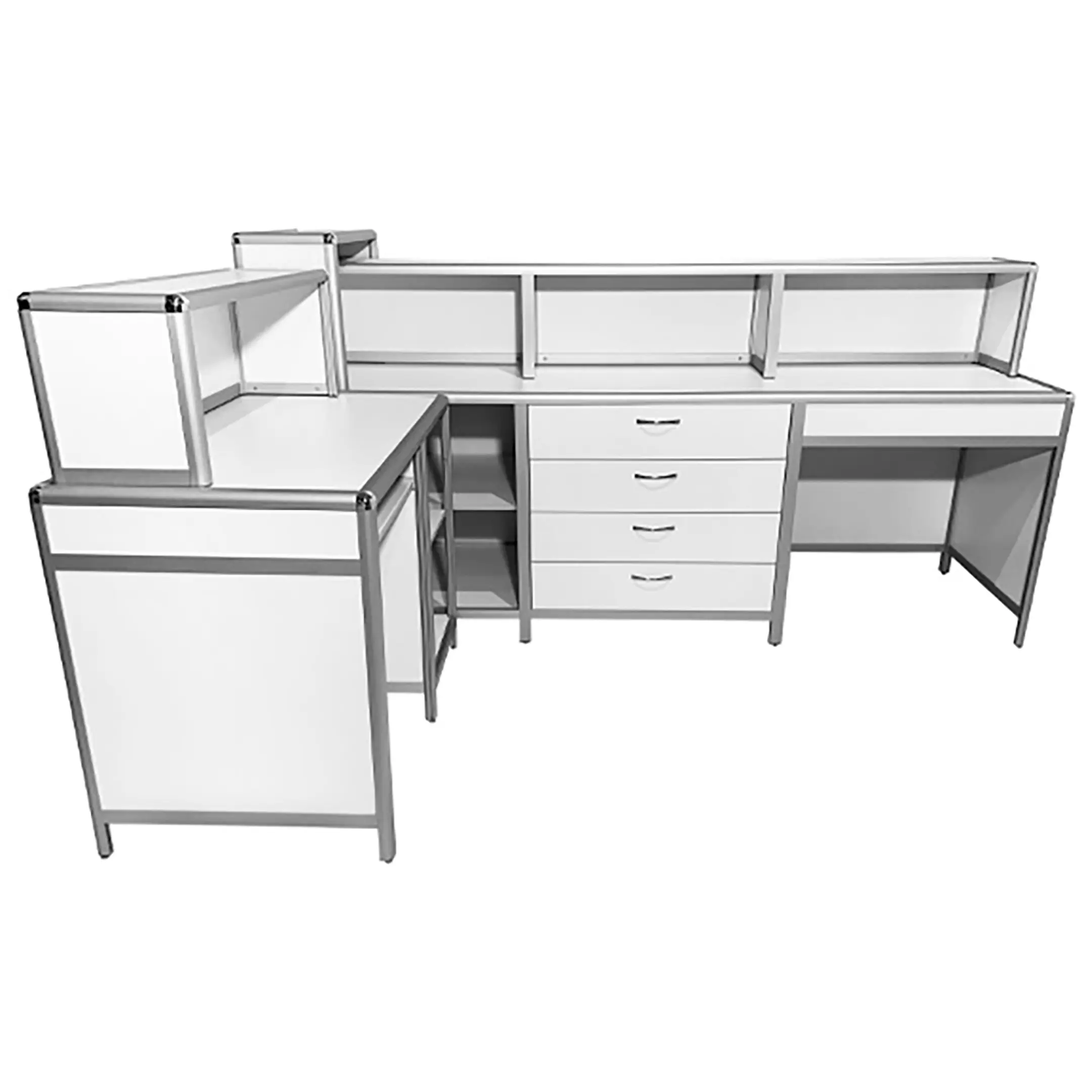 Стол-пост медицинский MD СтП 11.04al (белый) — это эргономичное и функциональное решение для обустройства рабочего места администратора в медицинских учреждениях. Модель имеет каркас из алюминиевого профиля с обшивкой из ЛДСП, оснащена надстройкой с полками, полкой для клавиатуры, дополнительной полкой слева и тумбой с четырьмя выдвижными ящиками справа.