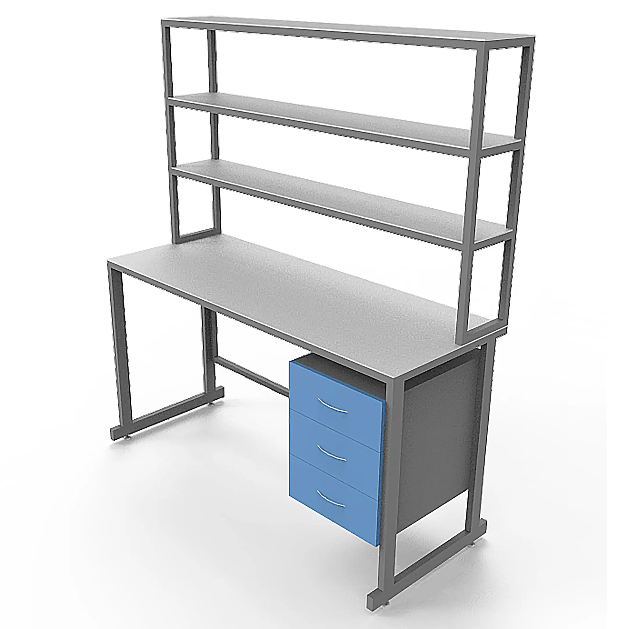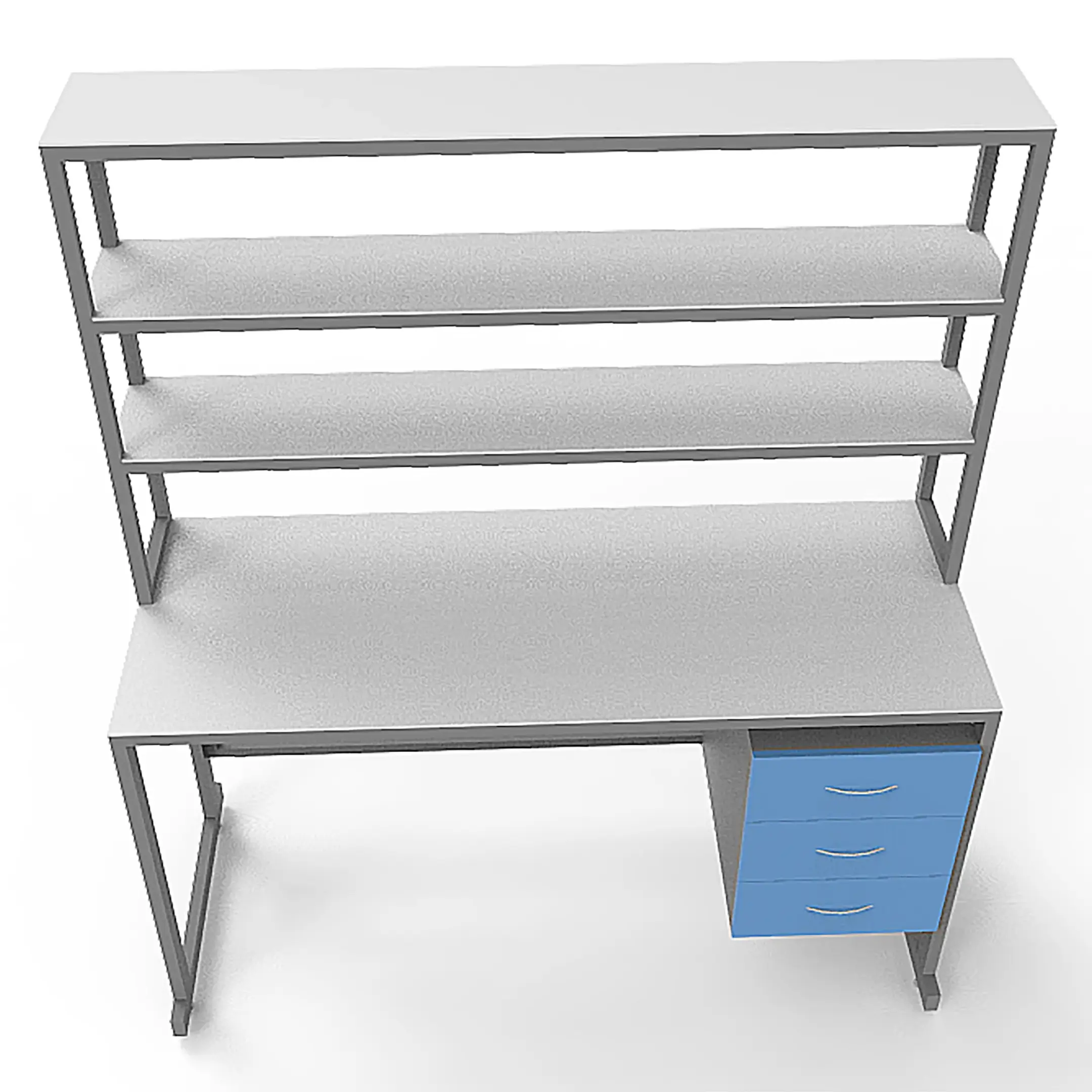 - Функциональная надстройка — три полки для дополнительного размещения оборудования, общая высота стола с надстройкой 1850 мм.