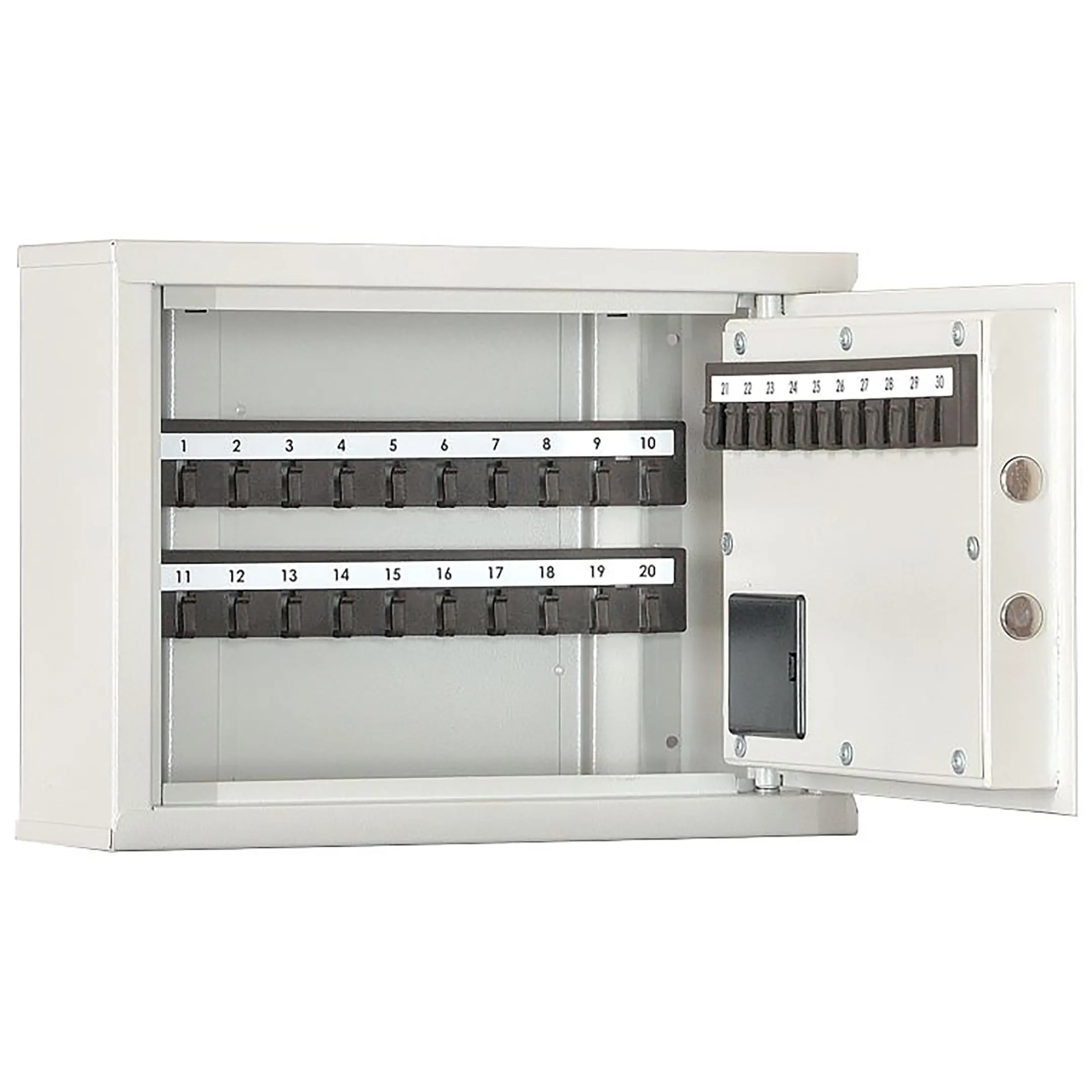 - Компактность и целевая вместимость — система предназначена для хранения до 30 комплектов ключей, что идеально подходит для организации порядка в кабинете руководителя, на стойке администратора, в диспетчерской или на небольшом посту, где важно контролировать ограниченный, но критически важный набор ключей.