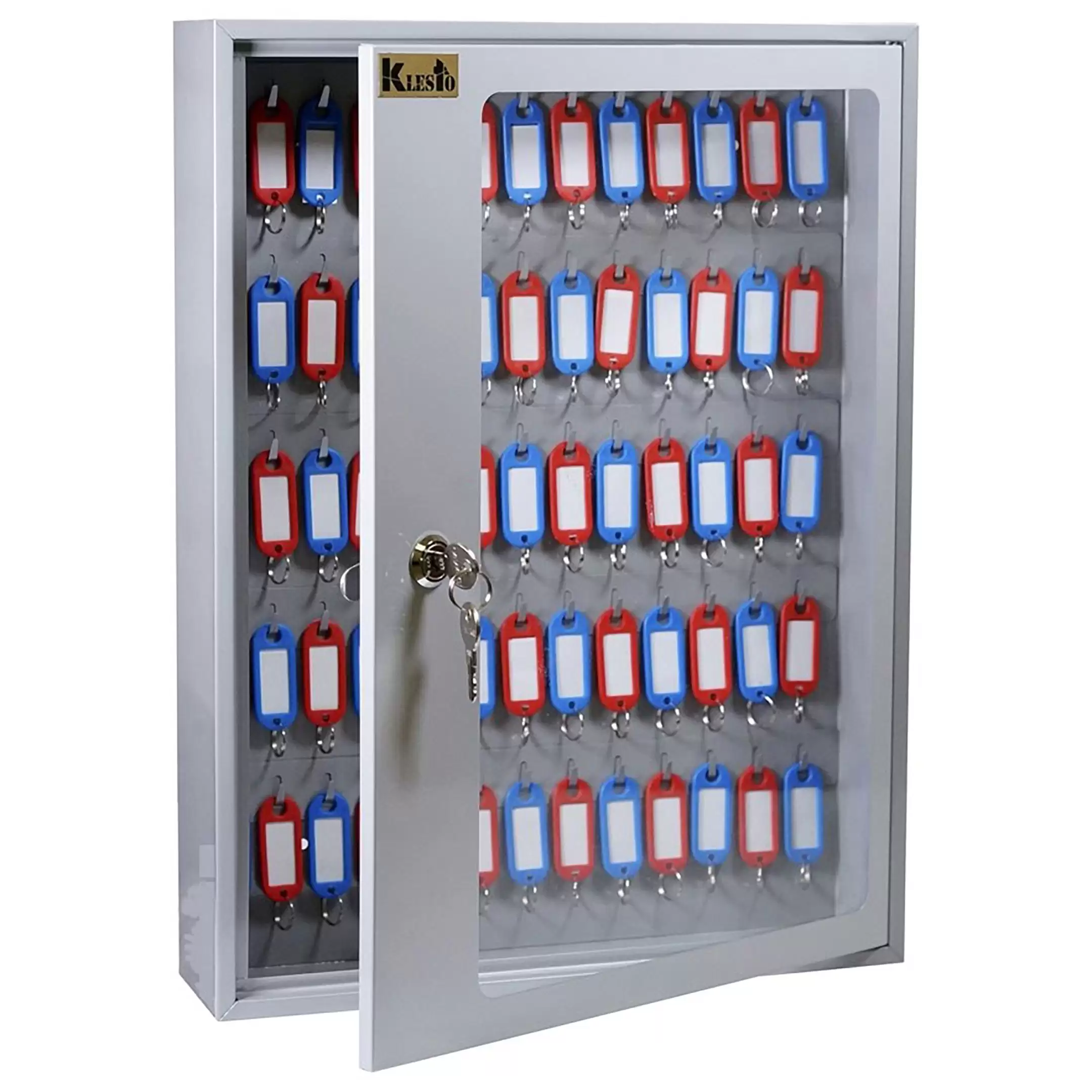 - Надежная конструкция и эстетичный внешний вид — металлический корпус и дверца со стеклом обеспечивают физическую сохранность и защиту от пыли. Стильный дизайн (часто в серебристом металлике) делает ключницу уместной в современных офисных интерьерах, помещениях охраны или ресепшенах.