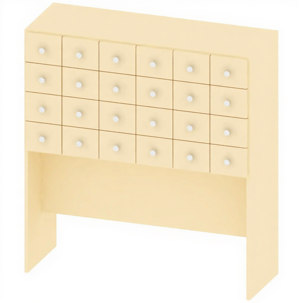 - Специализированное хранение — 24 ячейки для упорядоченного размещения каталожных карточек и формуляров.