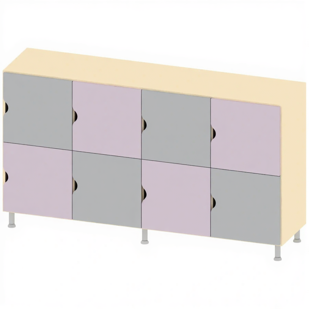 - 8 индивидуальных ячеек — обеспечивают удобное и организованное хранение одежды и личных вещей для нескольких человек.