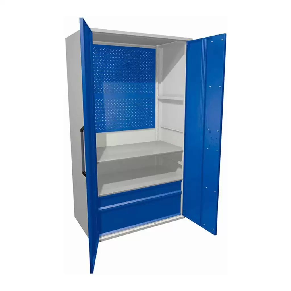 - Защита содержимого и безопасность — распашные двери с надежными замками (часто навесными или встроенными) обеспечивают защиту ценного инструмента и оборудования от несанкционированного доступа, пыли и внешних воздействий. Конструкция выдерживает значительные весовые нагрузки.