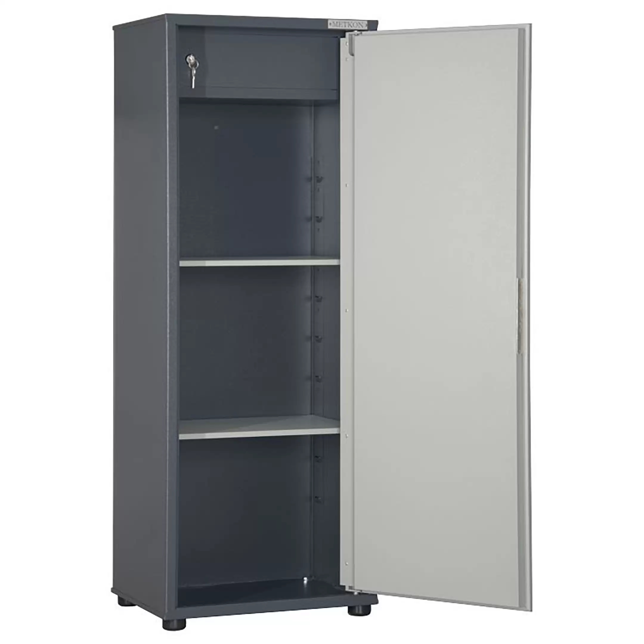 - Гибкая организация внутреннего пространства — модель оборудована регулируемыми по высоте металлическими полками, что позволяет адаптировать внутреннюю планировку под различные типы хранения: от стандартных архивных папок формата А4 до канцелярских принадлежностей, книг и личных вещей сотрудников.