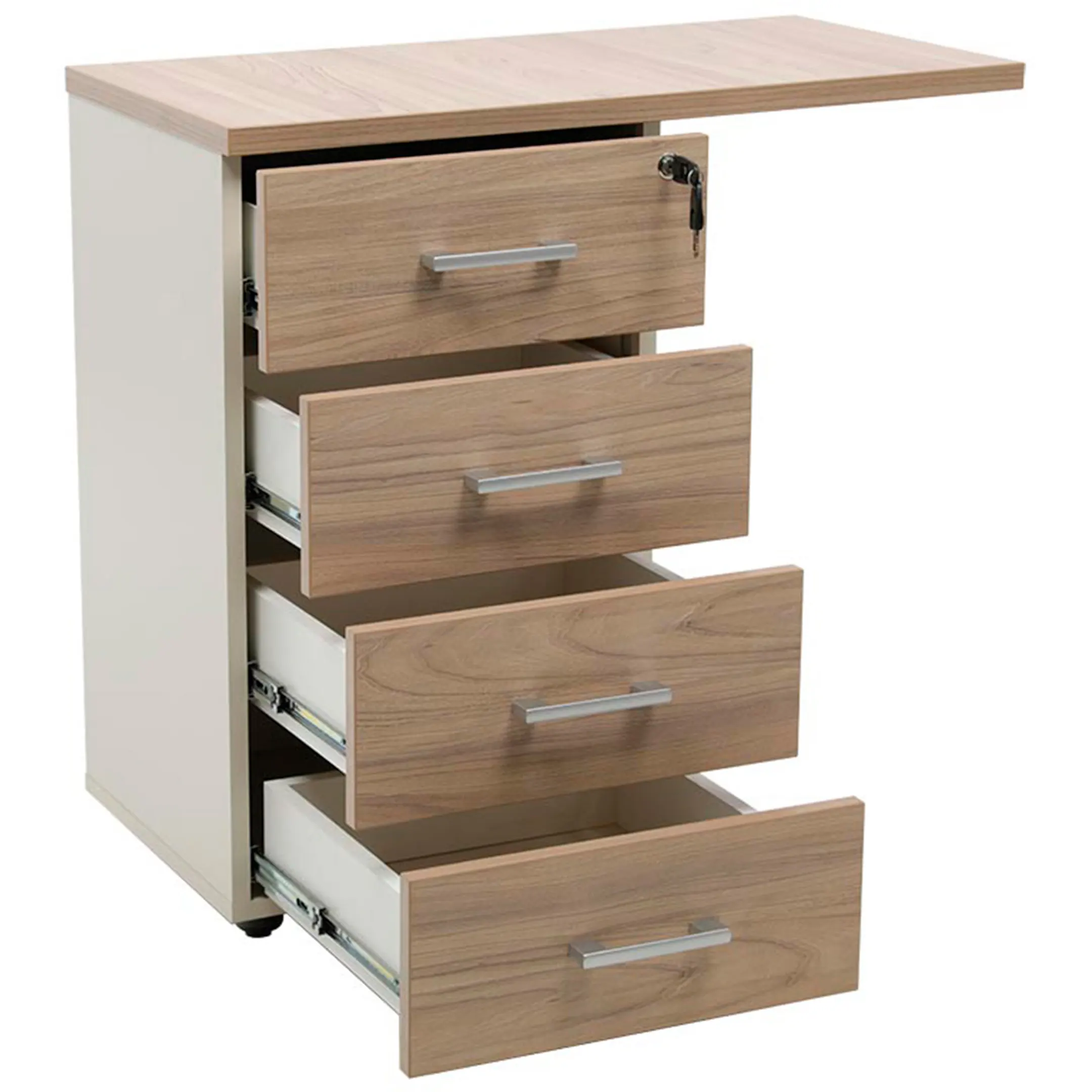 • Тумба снабжена центральным замком и оснащена пластмассовым лотком для канцелярских принадлежностей в верхнем ящике.
