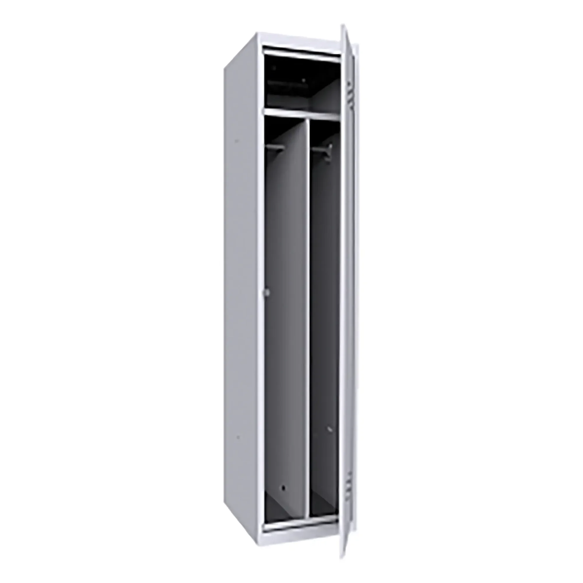 • Особенностью шкафа является внутренняя перегородка, создающая две раздевальные зоны, в каждой из которых имеются металлические перекладины для вешалок, два пластиковых крючка для одежды;