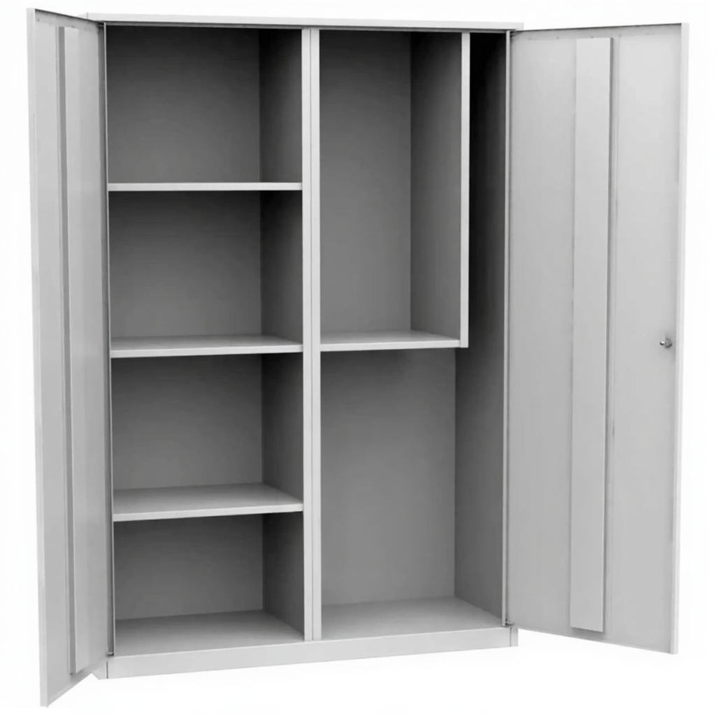 - Универсальность для различных типов имущества — конфигурация с полками делает шкаф пригодным не только для классического уборочного инвентаря, но и для хранения архивных папок, канцелярских запасов, средств индивидуальной защиты или небольшого технического оборудования.